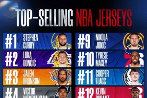 体育资讯1月21日讯 NBA官方公布了25-26赛季上半赛季球员的球衣销量排行,该数据均基于NBAStore的销售数据。