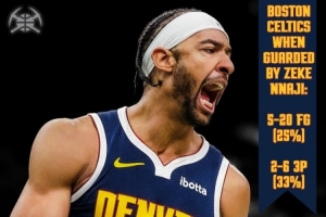 掘金官方今日晒出了一组数据,昨天凯尔特人球员面对纳吉防守时,运动战20中5,三分6中2。