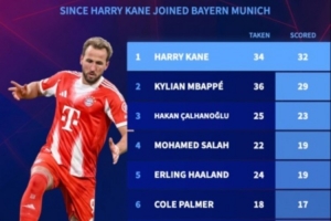 德转数据统计显示,凯恩自加盟拜仁后打进32粒点球是同期最多。