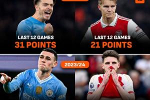 对比联赛最后12轮的战绩,22/23赛季,曼城31分阿森纳21分。23/24赛季,曼城32分阿森纳31分。24/25赛季,曼城27分阿森纳21分。