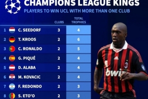 体育资讯2月16日讯 《转会市场》统计了能够随不同球队赢得欧冠的球员,西多夫是唯一随3支不同球队夺得欧冠的球员。