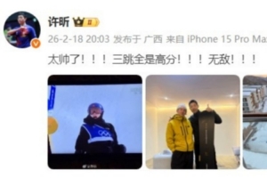 许昕在社媒写道:“太帅了!!!三跳全是高分!!!无敌!!!”