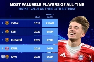 体育资讯2月22日讯 拜仁小将卡尔今日迎来18岁生日,数据统计显示他也是历史同龄德转身价并列第四贵的球员。