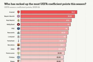 体育资讯03月14日讯 The Athletic统计了欧洲联赛俱乐部本赛季目前为止挣得的欧足联系数积分,阿森纳以30.5分领跑,拜仁、皇马、中日德兰、巴黎位列前五。