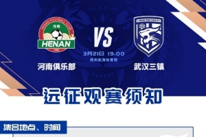3月21日,武汉三镇将在2026怡宝中超联赛第3轮中客场对阵河南俱乐部。即将与各位远征军在看台上相见,期待我们的战斗时刻!