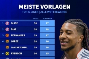 体育资讯3月21日讯 德国转会市场统计了五大联赛球员本赛季各赛事的助攻次数,并列出榜单,奥利塞27助断层居首。
