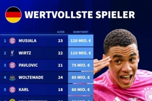体育资讯3月29日讯 德国转会市场统计了德国球员的身价,并列出榜单,穆西亚拉1.2亿欧居首,维尔茨1.1亿欧次席。