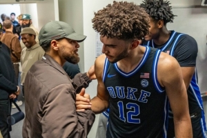 赛后戴尔·库里、斯蒂芬·库里、赛斯·库里父子三人到访了杜克的更衣室,而作为校友的赛斯见到这群学弟们也非常开心。